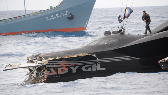 On the 2010 season of Whale Wars one of the most interesting of these dramas involved the Ady Gil, a futuristic hi-tech black trimaran (imagine Batman’s penis). The crew of the Ady Gil, led by Captain Pete Bethune, shave their heads before embarking on the ship, looking like human-sized homunculi. They challenge the Japanese whaling fleet with a phallic arsenal of air-powered spud guns and bottles of butyric acid (the same chemical that gives rancid butter its intense smell) and bows and arrows. Like an enraged father, the Japanese ship the Shonan Maru 2 responds, as might be expected, by ramming the Ady Gil, cutting the ship in two and essentially castrating it. The desire for the whale-mother has led to the greatest fear of these ‘little boys’, the loss of the penis. The traumatized crew of the Ady Gil deal with this in their own ways. One crew member challenges the less imposing father figure of Chuck Swift, Captain of the Bob Barker (the other new Sea Shepherd ship), while Pete Bethune devises a number of methods of gaining revenge which include a flaming high powered cutting torch that almost starts the Bob Barker on fire. After considering many (somewhat hair-brained) schemes Bethune eventually takes a jetski over to the Shonan Maru in the dark, jumps aboard, penetrates the ship’s defenses (literally using a knife), and confronts the crew. He is arrested and taken back to Japan to stand trial***.