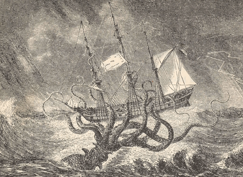 An example of the devouring mother would be the Kraken. This creature is a giant squid that rises from the depths, enveloping ships in its tentacles, and dragging them down into the sea. The Kraken is decidedly female in shape. It reminds us of female genitalia – the vagina dentata, only with a sharp castrating beak. Sailors feared the Kraken and wove stories of it, perhaps based on sightings of real giant squid that would sometimes be seen dead on the surface of the ocean (in life these creatures dwell exclusively in the depths). Psychoanalytically speaking, the Kraken is the image of the internalized bad parent (or object), the frustrating, angry, devouring, all-powerful mother of our infancy.