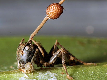 Recently I ran across some articles that got me thinking of ‘zombification’ in the animal Kingdom. A really great summary by Mo Constandi on his blog Neurophilosophy (Costandi, 2006) as well as an article by Evans, Elliot, & Hughes (2011) describe brain altering fungi – usually from the genus Cordyceps. This entomopathogen (something that causes disease in insects) infects ants when its spores attach to the outside of the insect. The spores then germinate growing into the interior of the ant’s body through the spiracles (i.e. respiratory holes in the exoskeleton) or its trachea (or throat). The fungus then sends mycelia, which are filament-like roots, into the body of the ant where it feeds on any soft tissue while avoiding any organs necessary for the ant’s survival. Eventually, the mycelia grow into the ant’s nervous system where they release chemicals that affect its brain. This causes the ant to change its behavior. Typically, the ant will then climb up a plant to an exposed location where it will then clamp on to a leaf. At this point the fungus will then consume the ant from the inside out and produce spores. These fruiting bodies (i.e. the ‘mushroom’ part of the fungus) will then sprout from the ant’s head and body. The fungus will then release spores from the fruiting body and exposed location of the ant will allow these spores to spread via the air and hence to other ants.